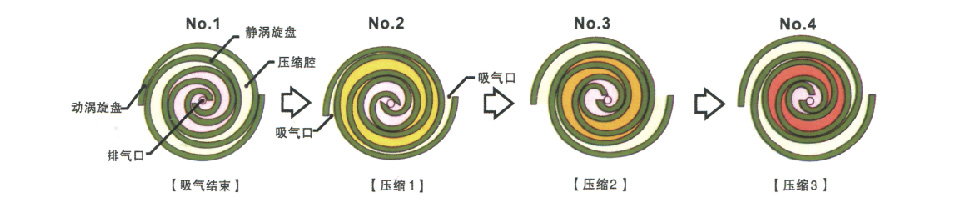 動渦旋盤按照下圖NO.1 → NO.2 → NO.3 → NO.4的順序旋轉,因此與點對稱的位置處的月牙形壓縮腔容量會逐步減小,氣體壓縮后從中心部的排氣口排出。